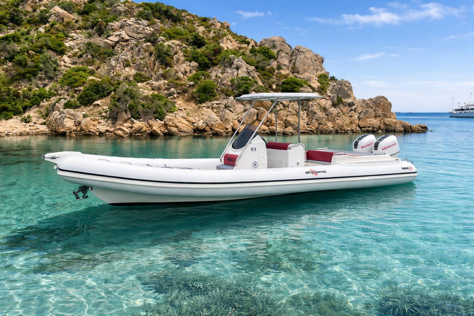 The Altamarea 27 Sport offers the perfect balance between performance, comfort, and versatility, making it ideal for exploring the Costa Smeralda in an exclusive and effortless way. Powered by twin Honda engines delivering 300 HP, it ensures a smooth, stable, and high-performance navigation, reaching speeds of over 40 knots while maintaining excellent efficiency. Spacious and well-designed, this RIB allows easy access to the most beautiful coves and crystal-clear waters of the La Maddalena Archipelago, including those reachable only by sea. On board, spaces are designed for both relaxation and social moments: large sunbathing areas at bow and stern dining area with table for lunch and aperitifs shaded areas with T-top and canopy The smart layout and refined details make this boat the perfect choice for a comfortable, dynamic, and stylish day at sea. Ideal for: Private tours in La Maddalena Archipelago Relaxing days, snorkeling, and exploration Families, groups of friends, and couples